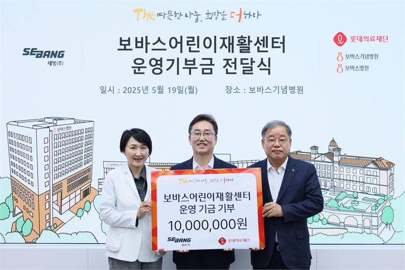한편, 이번 기부금 전달식은 지난 19일 보바스기념병원(성남시 분당구)에서 진행되었으며, 세방㈜ 최종일 대표, 김근영 경영관리본부장, 롯데의료재단 김천주 이사장, 나해리 의료원장 등 양 기관 주요 관계자들이 참석했다.