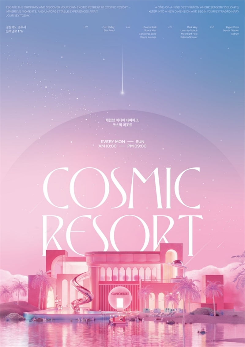 코스믹 리조트는 '우주(Cosmic)'와 '리조트(Resort)'의 결합으로 탄생한 복합 엔터테인먼트 공간이다. 총 1,400평 규모의 2층 공간에 13가지 우주 테마 공간을 조성, 단순한 전시를 넘어 관람객 참여와 상호작용을 통한 몰입감 있는 경험을 제공한다.